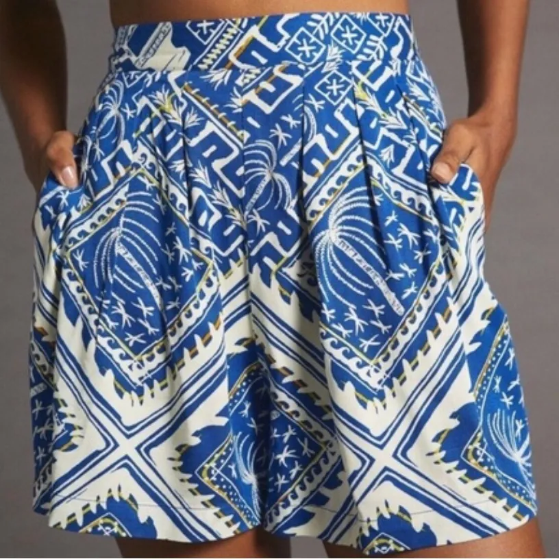 Worn once; Rayon with beautiful palm tree/floral/leaf pattern; back zip/button; 3” inseam; 12.5” ris... Show more