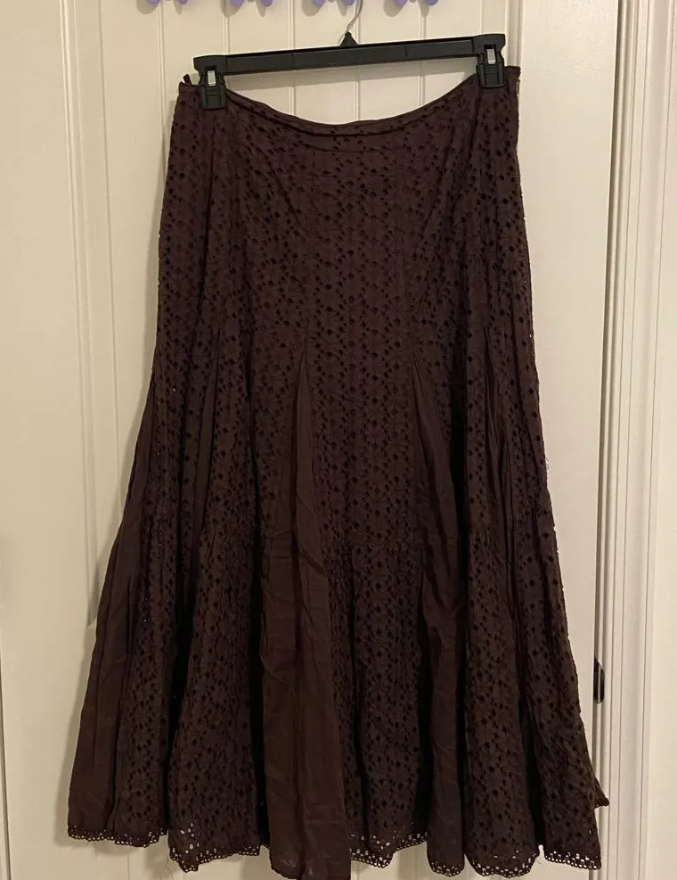 Women’s Femme skirt. Skirt is made of a dark brown material with an embroidered cutout design—pattern gives skirt a texture. Skirt is fully lined and zips up the side. Size 10. Smoke free home! Waist 16 inches across, length 34 inches