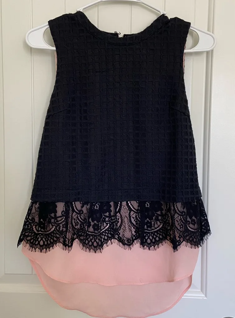 Women’s Greylin blouse. Top is black checkered stitch textured with a lace design and pink underlayer. Zips up the back. Sleeveless cut. Size XS. Smoke free home! Pit to pit 16.5 inches, length 24 inches