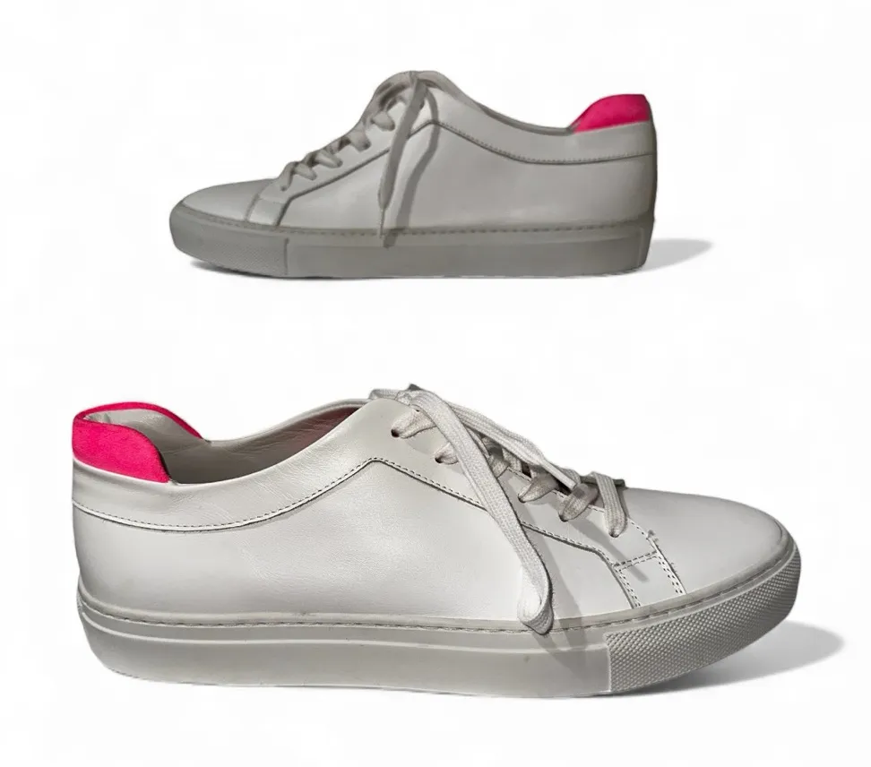 The M. Gemi The Palestra Due Women's EU 39.5 Low Top White Leather Hot Pink Sneaker is a stylish and versatile shoe perfect for various occasions that fits US sizes 8.5 wide or 9 narrow. Made from high-quality leather with hot-pink suede accents, this Sneaker features a round toe shape, lace-up closure, and a comfortable foot bed for maximum comfort. The hot pink suede accents add a pop of color to the white leather base, making it a trendy choice for the modern woman. With quality Italian leather and workmanship, cushioned insoles, and wide range of activities it can support, this sneaker is a must-have addition to any wardrobe. These are like new!! Some light scuff/dirt action, but no obvious signs of wear. These shoes retail for almost $220 new!