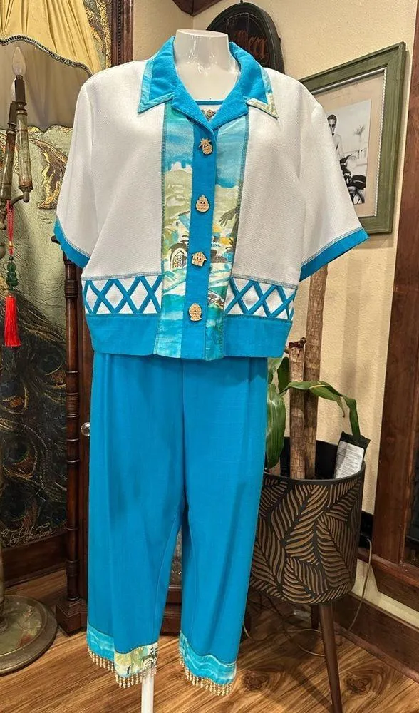This exquisite vintage 3 pice outfit features a striking combination of blue and white, highlighted by turquoise accents for a fresh look. Designed for comfort, it offers a relaxed fit that is perfect for casual outings or stylish gatherings. The solid color and coordinated design make it a standout piece in any wardrobe. Beautiful bided trim finish on ankles area. Woods accents.