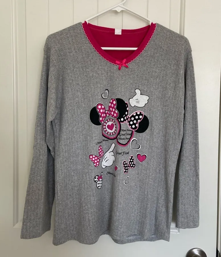 Women’s sleepwear top, no brand tagged. Top is gray with a pink interior. Neckline is decorated with pink lace & a tiny bow. Front has Minnie Mouse decal. Material is a warmer material, definitely for cool weather. Size XL. Smoke free home!