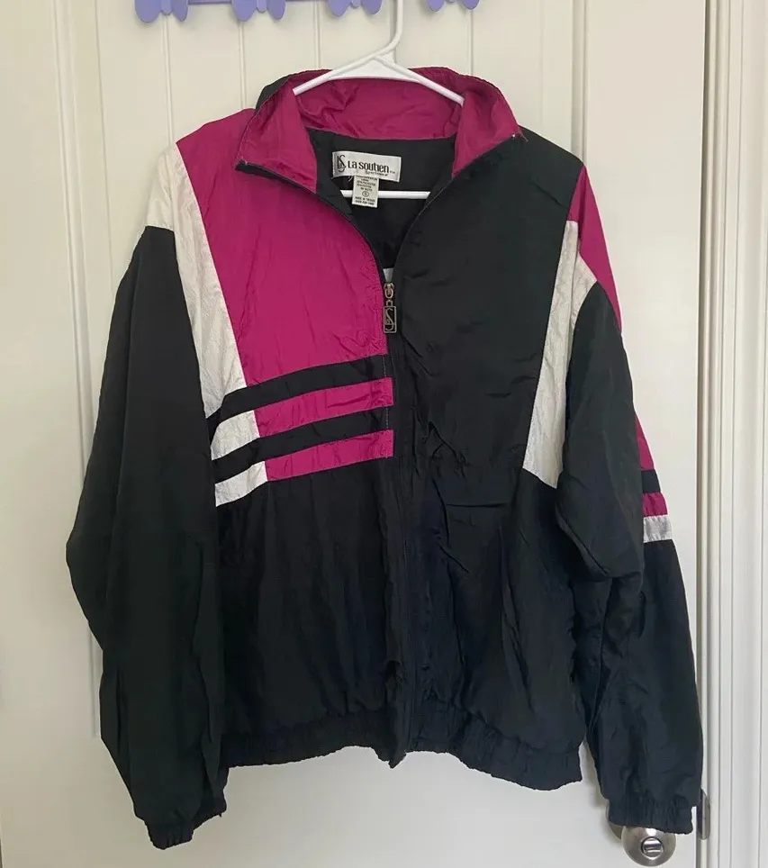 Vintage women’s La Soutien windbreaker jacket. Jacket is black pink & white patterned. Has pockets & full front zip. Sleeves have elastic bands around cuffs. Size small. Smoke free home!