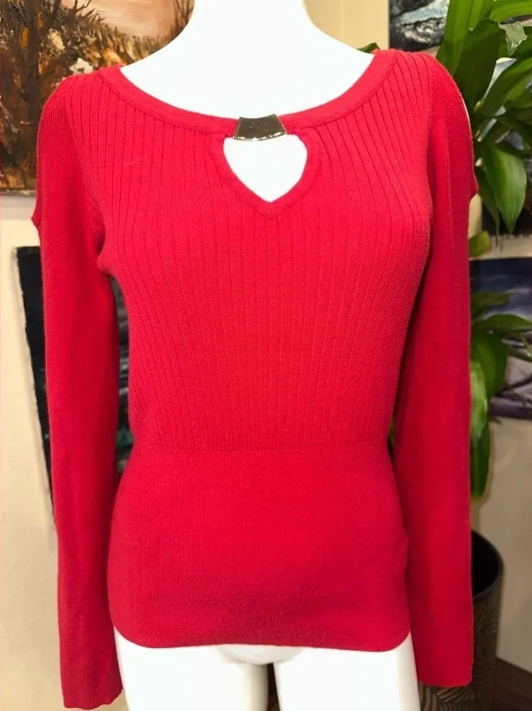 EUC XOXO red ribbed sweater with shoulder cut off and gold buckle front Sz XL STRECHY