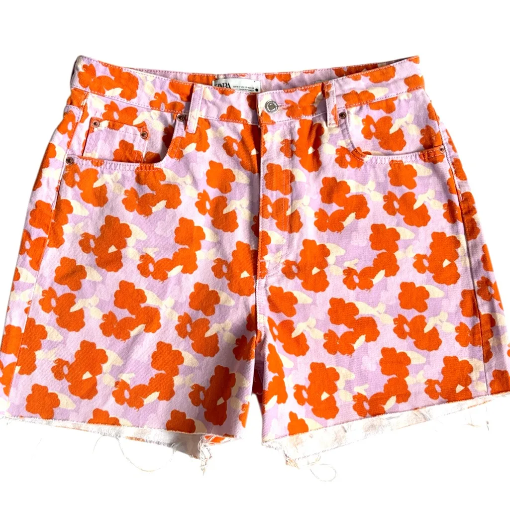 Worn once; Cotton floral denim; 4” inseam; 13” high rise; laying flat waist measures approx. 17“ acr... Show more