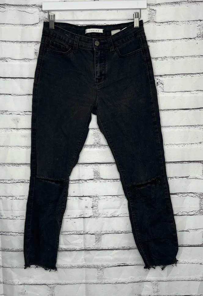 Sleek and modern Eunina “Clara” jeans featuring a washed-black finish, flattering high rise, and cropped skinny leg. Distressed knee panels and raw hems give them a stylish, lived-in edge perfect for casual outfits or elevated streetwear looks. Soft stretch denim offers comfort and a sculpted fit.** ⸻ Key Features: • Brand: Eunina • Size: Women’s 7 • Fit: High Rise • Cropped Skinny • Color/Wash: Washed Black • Material: 79% Cotton / 20% Polyester / 1% Spandex • Measurements: 26” Waist / 25” Inseam / 10.5” Rise • Features: Distressed knees • Raw hem • Zip fly • Five-pocket design • Stretch fabric • Condition: Excellent pre-owned condition — no major flaws ⸻ Style & Use: A perfect choice for pairing with graphic tees, bodysuits, chunky sweaters, or boots. The cropped raw hem works well with sneakers or ankle boots, and the high-rise cut gives a flattering silhouette for everyday wear, concerts, shopping days, and casual nights out. ⸻ Condition: Pre-owned item — please inspect all photos closely and ask any questions prior to purchase.