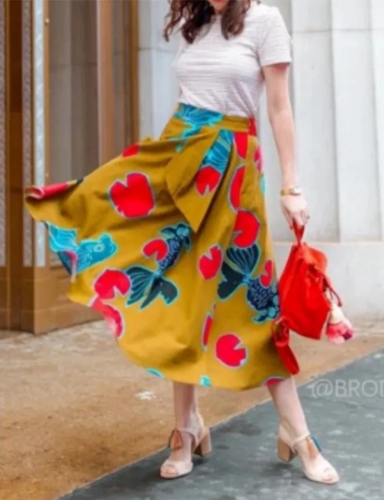 Whimsical and vibrant A-Line Midi Skirt by Eva Franco (Style СP7002P). This gorgeous petite skirt features a stunning print of blue and black goldfish swimming among vibrant pink/red lily pads set against a mustard yellow/olive green canvas. It has a flattering, tull A-line silhouette, perfect for twirling! • Brand: Eva Franco • Size: 8P (Petite 8) • Style #: CP7002P • Color: Mustard Yellow/Olive Green, Blue, Pink/Red, Black • Material: Shell: 100% Cotton; Lining: 97% Polyester, 3% Spandex • Closure: Side zipper (based on typical Eva Franco A-line designs) • Care: Hand Wash, Iron Low (See care tag in photos) • Condition: Excellent pre-owned condition • Brand: Eva Franco • Size: 8P (Petite 8) • Style #: CP7002P • Color: Mustard Yellow/Olive Green, Blue, Pink/Red, Black • Material: Shell: 100% Cotton; Lining: 97% Polyester, 3% Spandex • Closure: Side zipper (based on typical Eva Franco A-line designs) • Care: Hand Wash, Iron Low (See care tag in photos) • Condition: Brand New NO TAGS • artsy statement piece, often sold at Anthropologie. Pair it with a simple black or white top to let the unique print shine! Pertect for garden parties, brunch, or a fun, retro-inspired look. Measurements (Approximate, Laying Flat): • Waist: 15"With not stretching • Length: 32" Eva Franco Goldfish Fish Print Lily Pad Water Garden A-Line Skirt Midi Skirt Full Skirt Petite 8P Whimsical Artsy Statement Piece Novelty Print Mustard Yellow Olive Green Cotton Skirt Retro Summer Skirt Anthropologie
