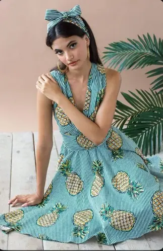 Item has been altered and taken out at waist - please see pictures and measurements below. Size 8 Pit to pit approximately 17.5” Waist approximately 16.5” Length approximately 44” You'll be picnic- or luau-ready in the Lucia Dress, a classic fit-and-flare style with V-neck, scoop back and circle skirt - with pockets! - in a crisp stretch cotton fabric. The vintage-inspired silhouette comes in our Pineapple Plantation print, a fun retro fruit pattern with orange and green pineapples tumbling across green stripes. Side zipper 65% Cotton, 33% Polyester, 2% Elastane Hand Wash Cold Dry Flat Low Iron if Needed Made in the USA