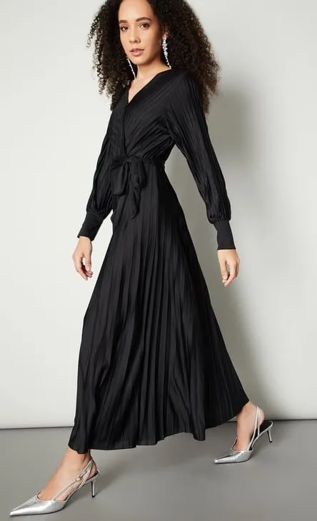 Evening Cutout Slit Plunge Belt Silky Long Sleeve Blinged Out hips Pleated Maxi Dress sz M Black Step out in style with this elegant black long sleeve dress. Its pleated design adds a touch of sophistication, making it perfect for any occasion. Style Details: The item has long, relaxed sleeves with cuffs and a full-length design. The fabric's sheen suggests a satin weave flattering silhouette, black satin silky plunging V-neck tie belt flowing long-sleeve Potential Use: These garments are versatile and can be worn as a dress for evening events or cocktail parties, or as luxurious loungewear or a peignoir (robe) at home.
