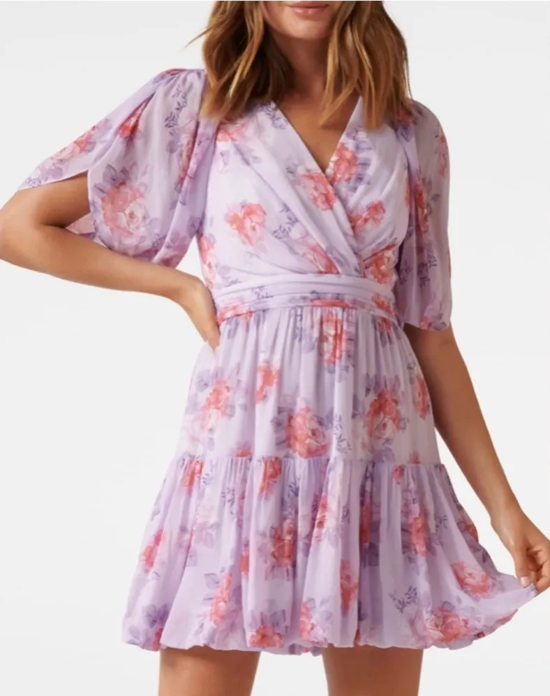 Surplice Vneckline Sheer tulip sleeve, ellbow length Zipper at back Tiered mini dress Really cute and feminine with floral print Great brunch or garden party dress Lined Flouncy and feminine Balloon hem Purple dress Preloved and in excellent condition, clean and steam sanitized. Please see pictures of aproximate measurements laid flat and fabric/care details. Smoke/Pet free home, ships ASAP! Box 17