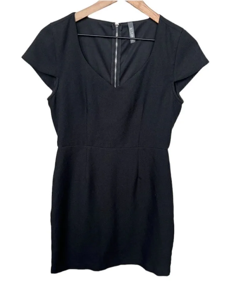 Evereve Allison Joy Classic Black Dress Cap Sleeves Exposed Zipper Size Medium The perfect closet staple! This black dress is so pretty and versatile. Flattering darts for a tailored fit, cap sleeves and silver exposed zipper in back. Sweetheart neckline. Above the knee. Lined. Excellent condition!
