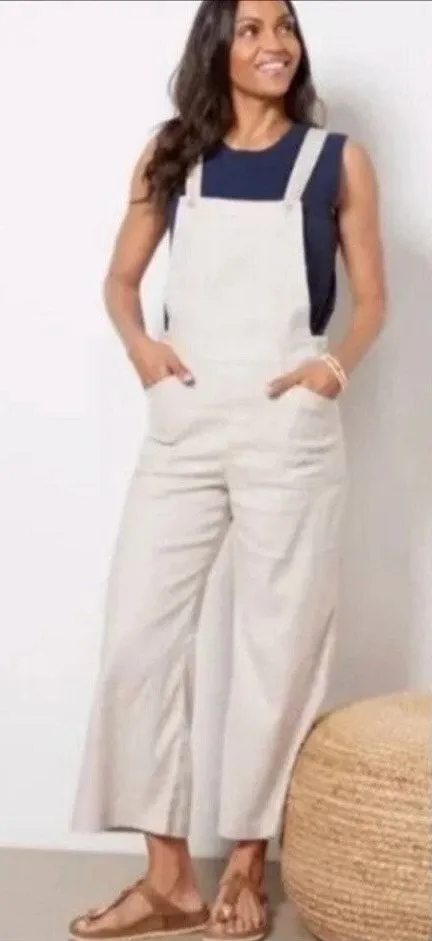 -Lightweight linen blend overalls. -Patch pockets. -Adjustable button straps. -Button closures at waist. -Beige/cream. -Linen/lyocell/spandex. Approx. Measurements Waist 14" across laying flat. Total length 53" N6 women's, overalls, jumpsuit, casual, classic, neutral, minimalist, basic