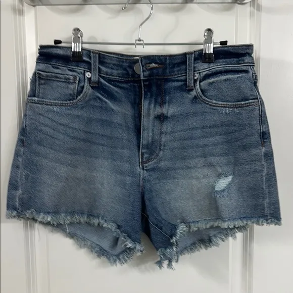 These Evereve jean shorts feature a classic cut-off style with a medium-light wash blue and natural fading. The distressed, frayed hem adds a trendy touch, making them perfect for casual outings.