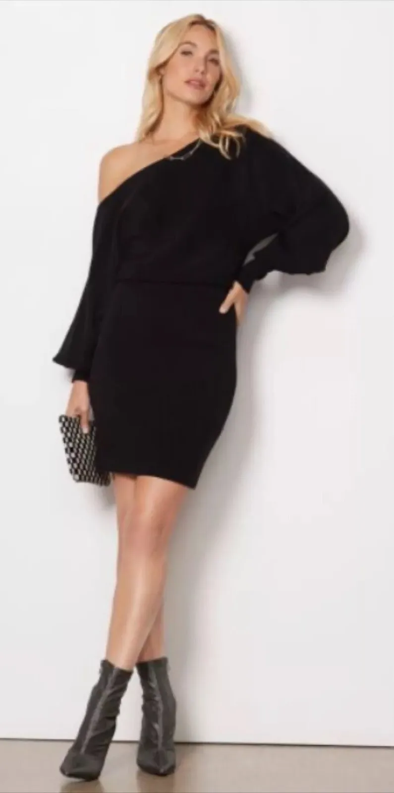 Chic off-the-shoulder sweater dress from Evereve. This elegant black dress features a sophisticated one-shoulder design, banded waistband and long balloon sleeves, perfect for a modern and stylish look. The knit construction offers a comfortable and flattering fit. NWT condition Measurements: armpit to armpit 17.5 in, waist side to side 14 in, length 36.5 in, sleeve from nape 24 in designer, luxury, knit, gothic, goth, whimsigoth, wimsygoth, NWT, nwt, Cocktail, Weekend, Party, Chic style, Romance, Date, Love, sexy, romantic, Party, Work wear, office, casual, classic, date night, night out, holiday, chic, trendy, stylish, vacation, travel, minimalistic, wedding, form-flattering, Off Shoulder neck, One Shoulder, Mini, Short, classy, chic, NEW, BNWT, sweater dress, Size 4, Size 6