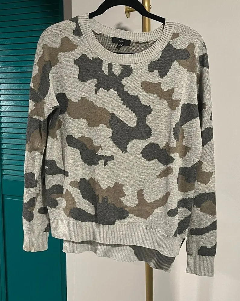 Effortlessly cool and cozy 💫 This FATE for Evereve camo knit sweater blends casual edge with luxe comfort. Features a soft neutral camo pattern with a subtle star accent on the sleeve — a signature FATE detail. Perfectly slouchy fit with ribbed cuffs and hem. Originally sold at Evereve for $118+, this piece pairs beautifully with denim or leather leggings for an easy, elevated weekend look. Details: 🪶 Brand: FATE for Evereve 🎨 Color: Gray / Olive camo with light star accent 🧶 Fabric: Soft knit blend (mid-weight) 👚 Fit: Relaxed, true to size Style tip: Add ankle boots and gold jewelry for a chic casual vibe ✨