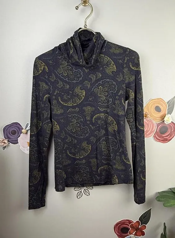 P2P 15" Length 23" Size XS Elevate your wardrobe with this stylish turtleneck long sleeve top, featuring a unique floral pattern perfect for any season. Made from soft, stretchy fabric, this top offers both comfort and a flattering fit. The subtle paisley design adds an elegant touch, making it versatile for both casual outings and dressy occasions. Pair it with jeans or a skirt for a complete look. Key features include:- Comfortable turtleneck style- Long sleeves for extra warmth- Distinct floral pattern- Soft and stretchy material- Ideal for layering or wearing alone.