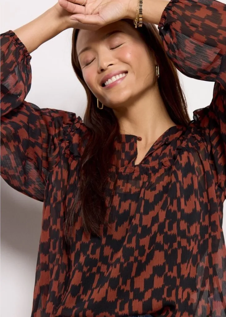 Sheer chiffon blouse with black and rust chevron print. Semi sheer Button detail at neck Mini ruffl... Show more
