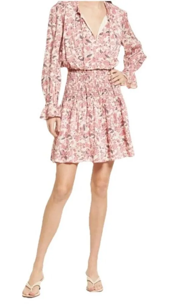 This beautiful pink floral dress from Evereve is perfect for any occasion. The fit and flare style, along with the smocked features, create a flattering silhouette for any body type. The long sleeve design is great for transitional weather, making it perfect for fall, spring, and summer. The knee-length dress is great for both casual and cocktail parties, and the bohemian theme adds a touch of whimsy. The dress is available in size S and is suitable for regular size types. The floral pattern, beach theme, and cottage design make it an excellent choice for a summer dress. #529