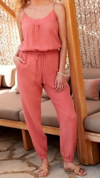 The Evereve Gemma jumpsuit is a women's one-piece garment in a vibrant coral color, designed for casual summer occasions. Made from 100% gauzy cotton, it features a solid pattern, sleeveless design, adjustable straps, and an elastic waistband for a relaxed fit. The lightweight material and drawstring closure enhance comfort, making it ideal for warm weather outings. This regular size L jumpsuit is machine washable for easy care. Pre-owned condition. Keywords: Evereve, Gemma jumpsuit, women's clothing, coral, summer fashion, casual wear, sleeveless, adjustable straps, elastic waistband, gauzy cotton, relaxed fit, one-piece, solid pattern. Brand: Evereve Color: Coral Department: Women Size: L Type: One-Piece Style: Gemma Jumpsuit Material: 100% Cotton Pattern: Solid Sleeve length: Sleeveless Occasion: Casual Season: Summer Closure: Drawstring Fit: Relaxed Garment care: Machine Washable D6