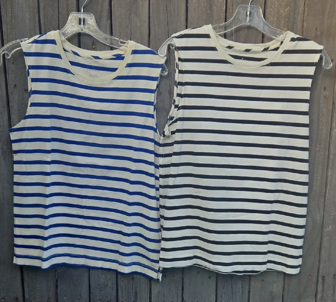 Chic striped tank tops by Everlane. Features bold blue and black stripes. Ideal for everyday wear.