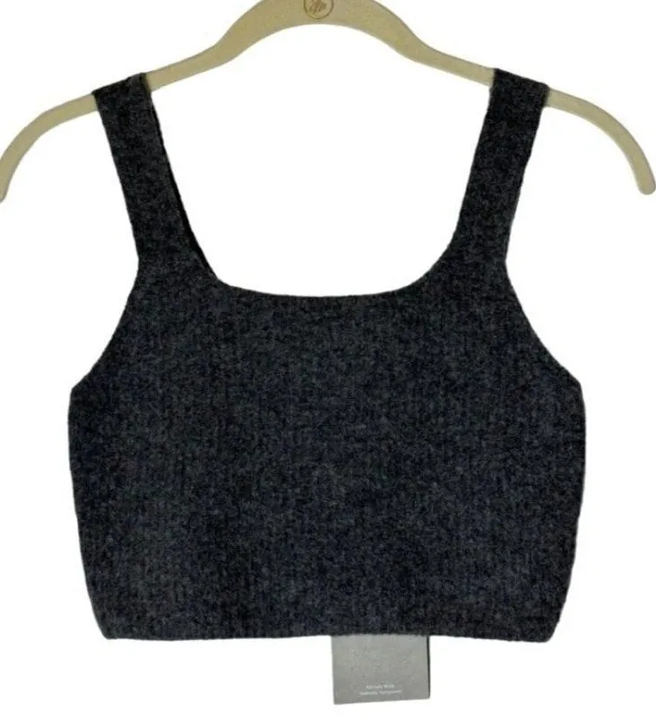 This tank from Everlane is in NWT condition. It is in solid heathered charcoal gray color in a cozy stretch knit fabric. It features; a scoop neckline, scoop back, sleeveless, cropped length and a straight hemline with pullover styling. Made from a wool, recycled nylon and yak hair and elastane blend.