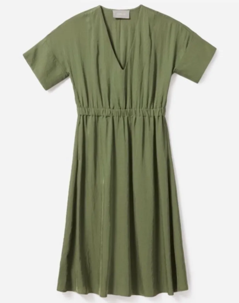 Green dress with short sleeves and a gentle v neck - feels almost like a satin. Tea leaf green colo... Show more