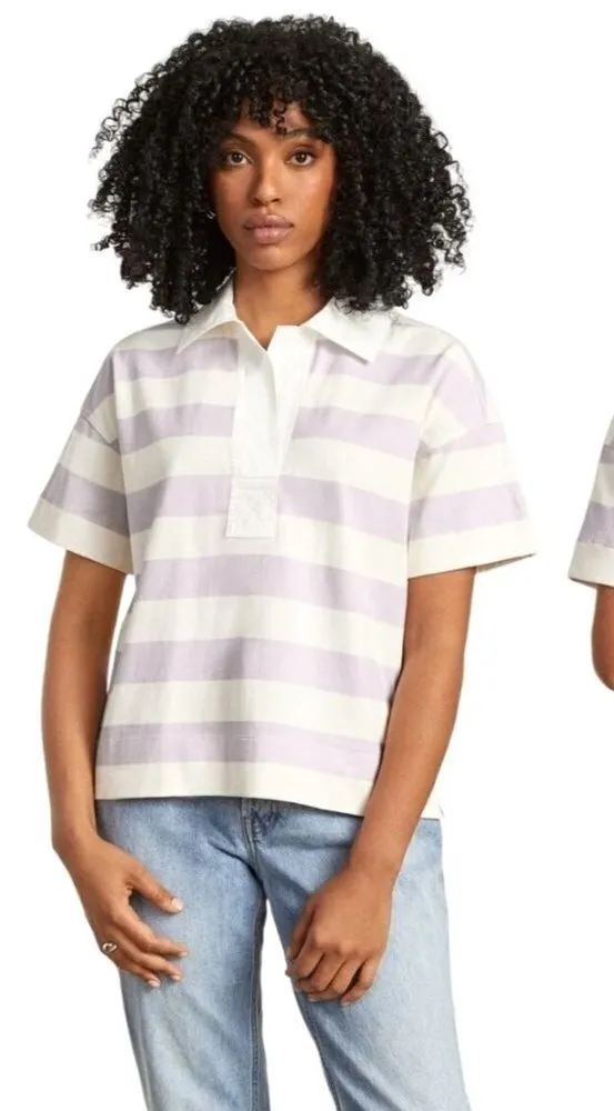 This polo shirt by Everlane is in NWT condition. It is in allover striped print in purple and white colors. It features short sleeves, signature embroidered "E" logo on sleeve, drop shoulders, a collared neckline, and a straight hemline. Made of 100% organic cotton.