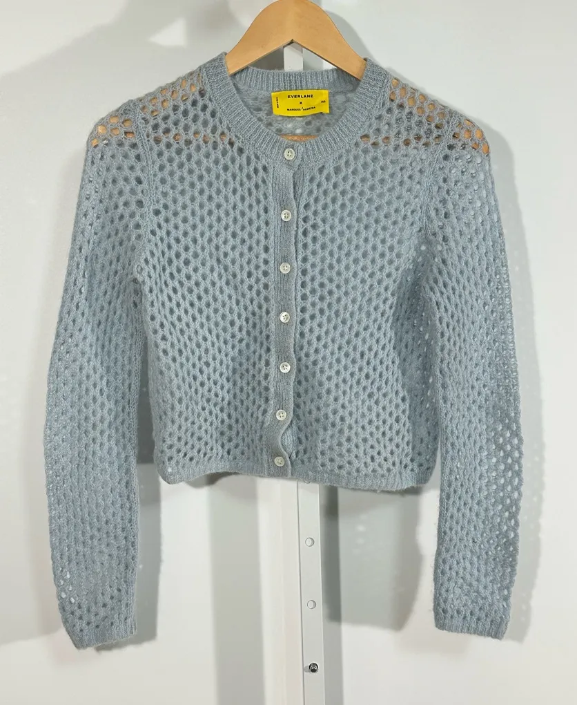 From Everlane’s limited-edition collaboration with Marques’Almeida — this dreamy open-knit cardigan blends Everlane’s minimal design with Marques’Almeida’s avant-garde edge. Done in a soft, airy mohair blend and finished in a pale ice blue that’s both cozy and cool. Slightly cropped fit, designed to layer over tanks or slip dresses for that effortless off-duty look. • Collaboration piece (Everlane x Marques’Almeida, 2022 capsule) • 37% mohair, 37% polyamide, 26% wool • Button front, open honeycomb knit texture • Made in Italy • Slightly cropped, relaxed through the body #everlane #marquesalmeida #everlanexmarquesalmeida #mohaircardigan #openknit #capsulewardrobe #minimaliststyle #quietluxury #fallstyle #depopfinds #poshstyle #scandistyle #modernvintage #everlanegirl #effortlessstyle