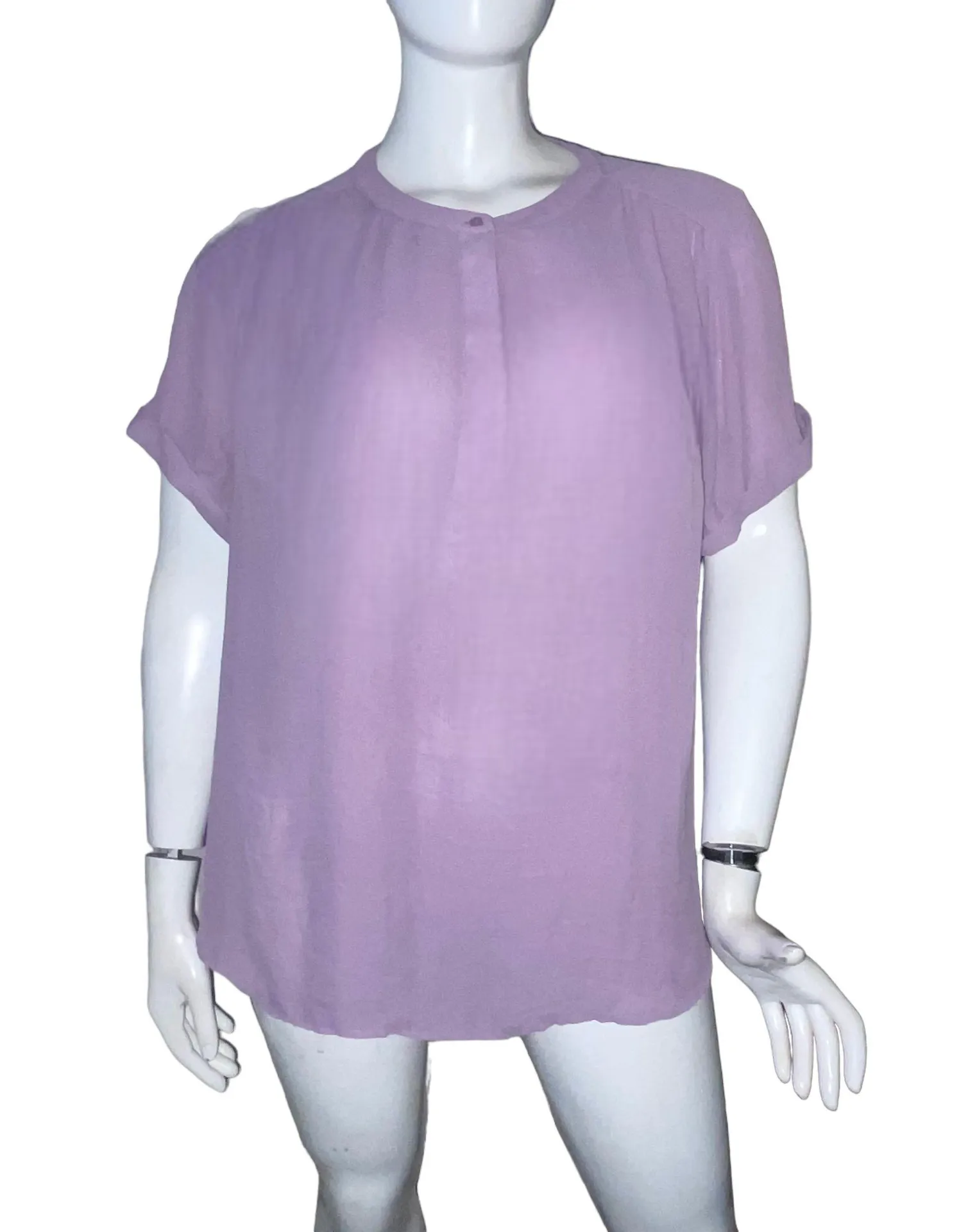 In excellent condition. Light purple color. Short rolled sleeves. 1/4 hidden buttoned collar with only the top button showing. Drop shoulder. Rounded hem. 29” pit to pit x 28” long