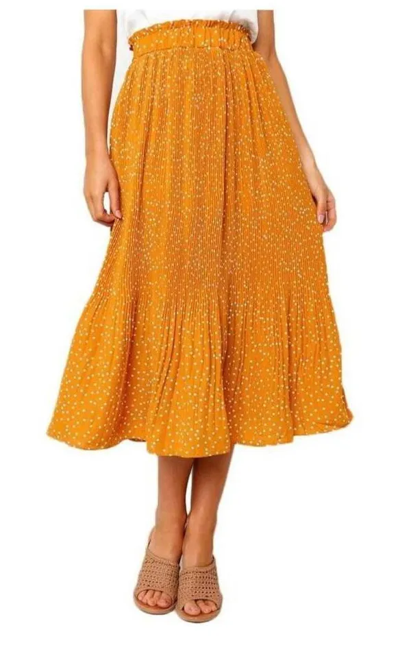 EXLURA Women's High Waist Mustard Yellow Polka Dot Pleated Midi Skirt, size M. This vibrant mustard yellow midi skirt features a playful white polka dot pattern and elegant pleats, making it perfect for both casual and dressier occasions. The high-waisted design with an elasticated waistband ensures a comfortable fit. Crafted from 100% polyester, this skirt is lightweight and retains its pleats beautifully. It's a versatile piece for your spring and summer wardrobe, offering a flowy and feminine silhouette. Excellent condition, appears new without tags. No visible flaws or signs of wear.