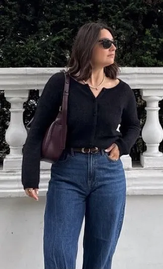 Sleek Express black knit cardigan with a fitted, cropped silhouette, perfect for layering over tees, tanks, or dresses. The quarter-length sleeves and button-up front give it a polished yet casual vibe, ideal for work, outings, or everyday wear. So trendy and chic. First pic is for styling purposes only, not exact item.