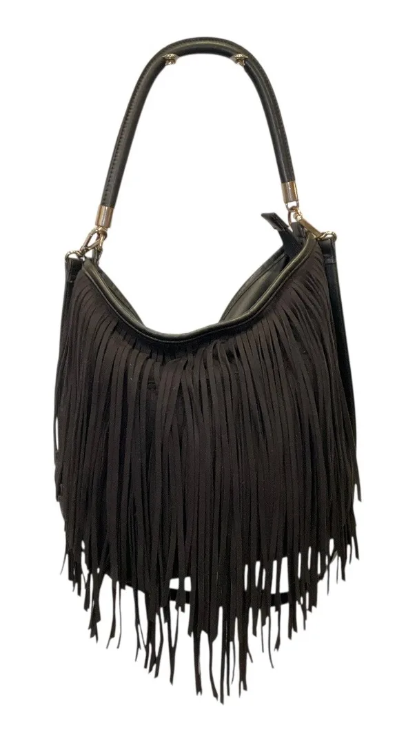 Express black faux suede fringe hobo style crossbody bag with long tassel detailing. Soft, flexible... Show more
