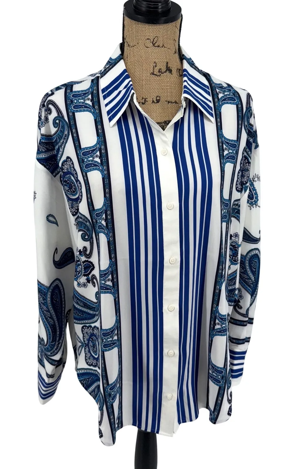 Excellent Pre Owned Condition No flaws A bold paisley and stripe print button-up shirt. This sty... Show more