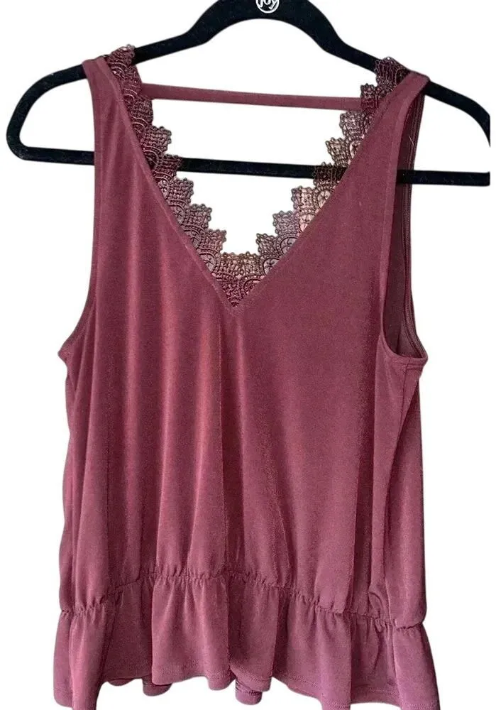 Elevate your wardrobe with this romantic burgundy tank top featuring delicate lace trim along the V-... Show more