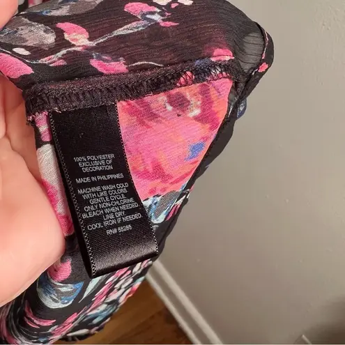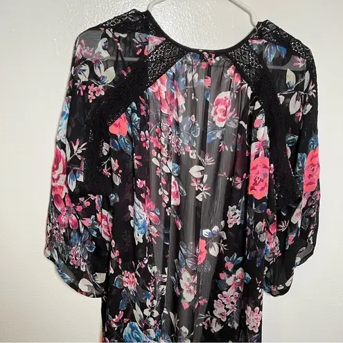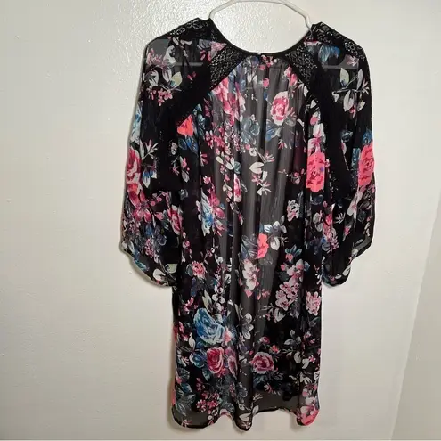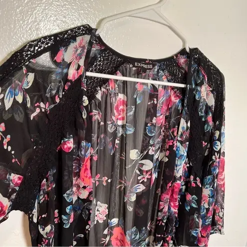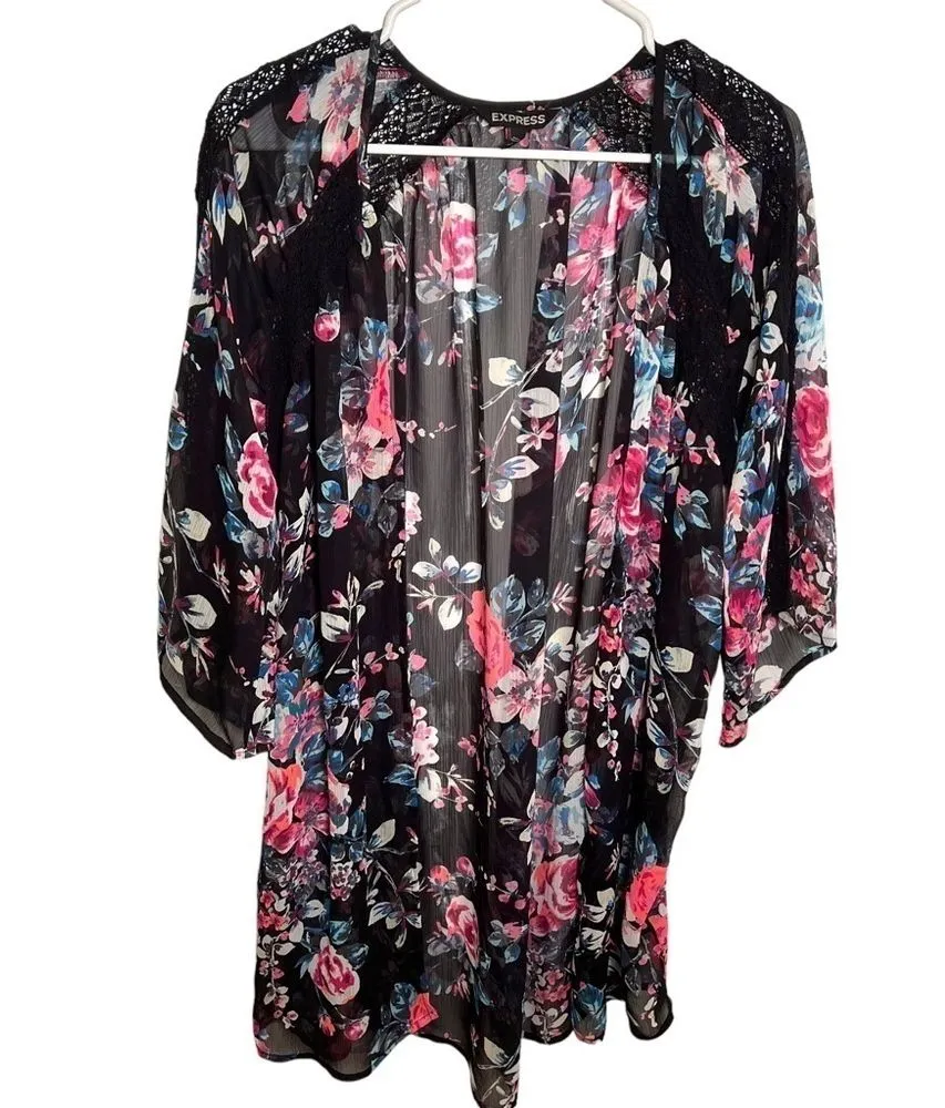 Great condition, minor wear. Express. Kimono. Open front. Short sleeve. Sheer. Black with pink and b... Show more