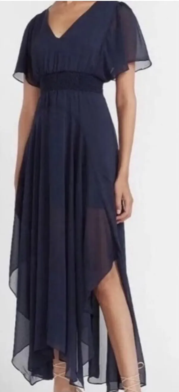 Elegant high low dress with V-neck. Short sleeves and flowing design. Ideal for special events. Eleg... Show more