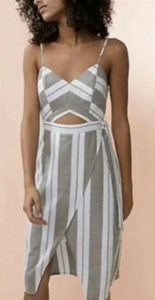 Cotton dress with midriff cutout. Smocked zipper back. Faux wrap skirt. Adjustable straps. EUC