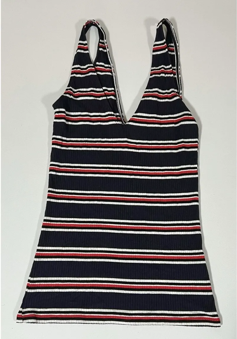 Express Navy Blue Red Striped Ribbed V-Neck Stretch Tank Top Tee T-Shirt Blouse Cami Camisole Size S... Show more