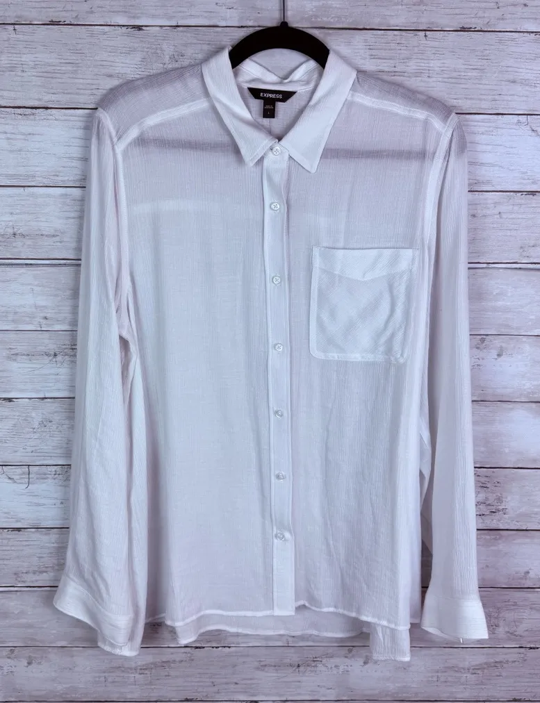 Button down Collared Long sleeve Sheer crepe fabric White Size large Flat measurements approximately... Show more