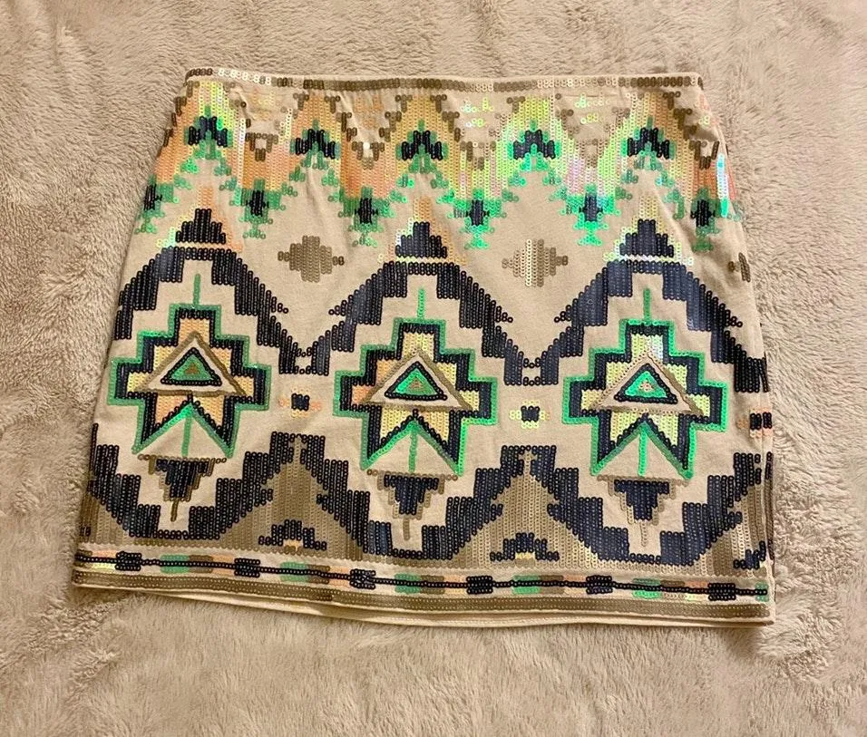 Sequin Aztec-like sequin design mini skirt. Base is a stretchy nude fabric. Skirt is covered front a... Show more