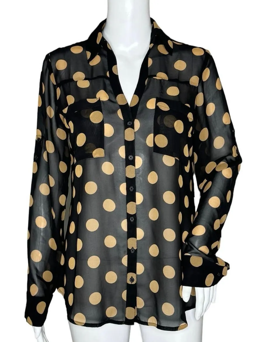 Express Shirt Womens Small Black Tan Polka Dot Portofino Office Casual Novelty Women’s Size Small... Show more