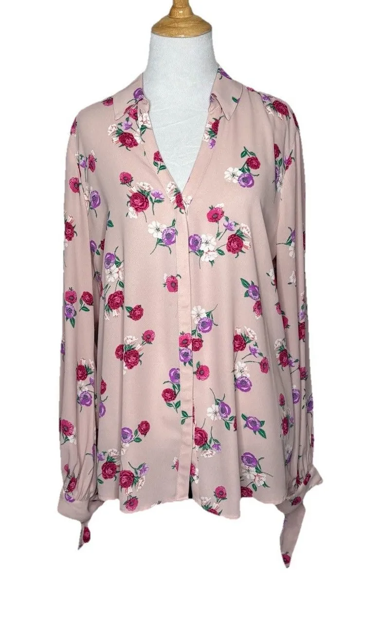 Express The Portofino Slim Button Down Shirt Blouse Pink Floral Long Sleeve Size Large. Women's. In... Show more