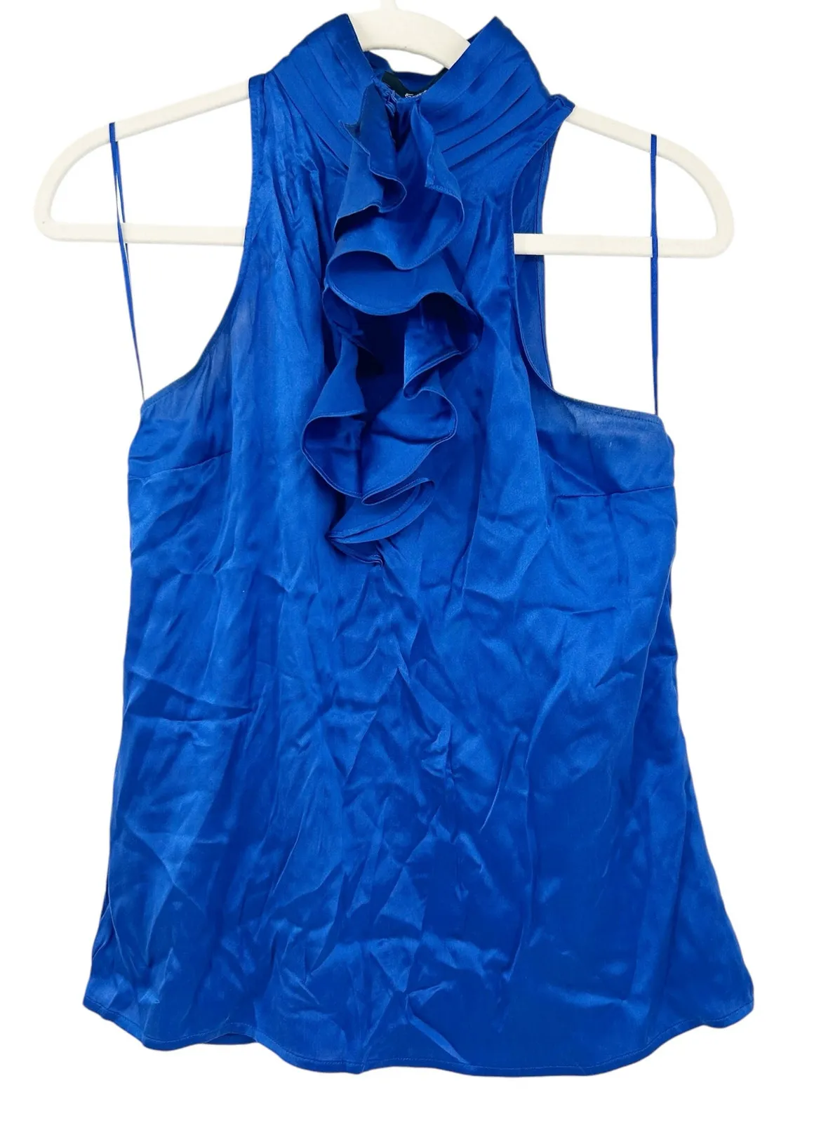Express Women Casual Chic Silk Blend Mock Neck Ruffled Tank Top Blouse in Royal Blue. Size Small. G... Show more