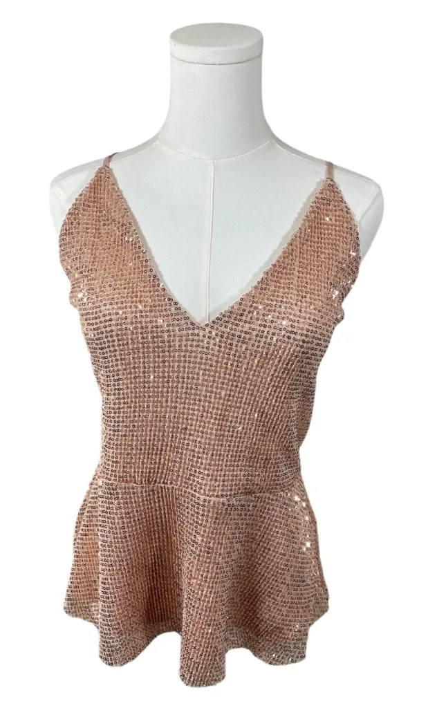 Beautiful sparkling rose gold sequin cami with double spaghetti straps and draped front detail. Full... Show more