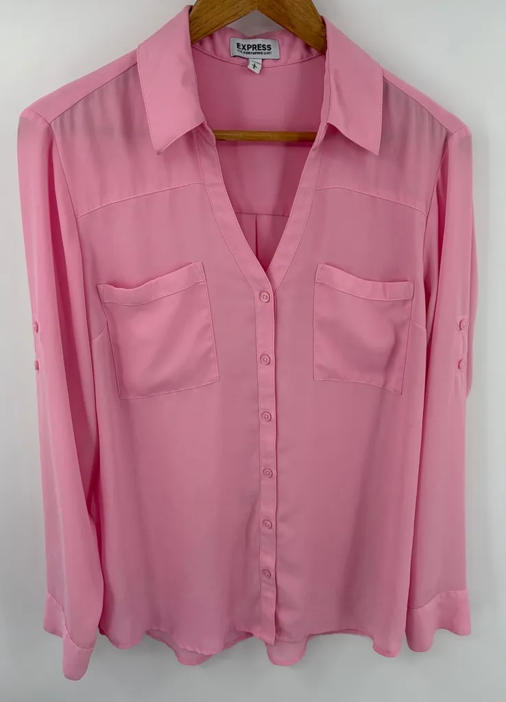 Express women’s the portofino bubble gum pink button up long sleeve shirt Size L Guc small blemish o... Show more