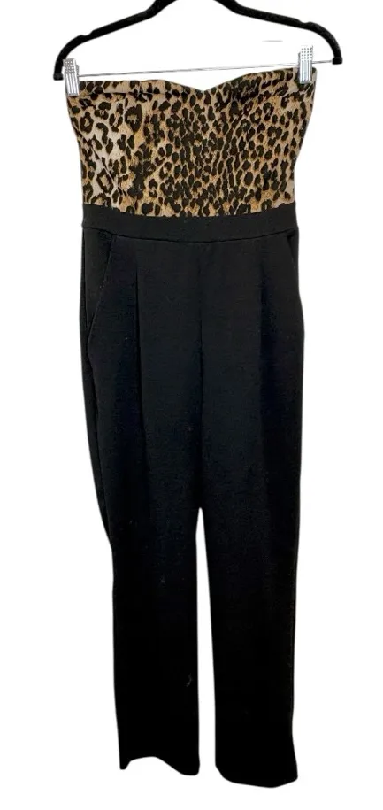 Bold strapless jumpsuit featuring a leopard-print bustier bodice paired with sleek black tailored pa... Show more