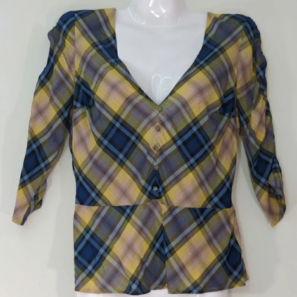 Express Yellow & Blue Plaid V-Neck Button Peplum Top Brand new with tags Plaid Print V-Neckline 3... Show more