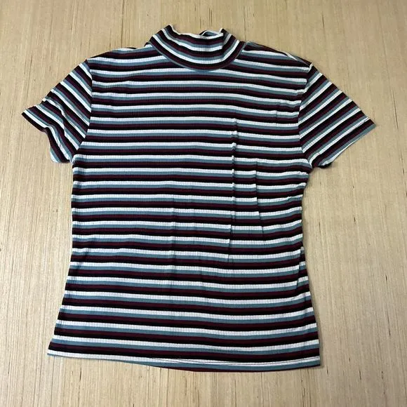 Add a pop of color to your wardrobe with this Eye Candy multicolored striped T-shirt top. Featuring a mock neck and pullover closure, this casual top is perfect for any occasion. The short sleeve and breathable 5% spandex and 95% cotton material make it a great option for any season - winter, summer, fall, or spring. The Eye Candy top comes in a regular fit and is machine washable. It is a juniors size large and has no vintage or personalized accents. With its striped pattern and versatile style, this top is a must-have for women's clothing. Get yours today! All measurements are taken flat and are approximate. Colors are burgundy, white, powder blue, navy.