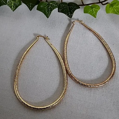 Beautiful earrings Gold laminate Large Teardrop shape hoops Pretty design Lever close Lightweight @18 gold hoops statement Large Teardrop oval casual dressy work office fashion staple everyday simple style