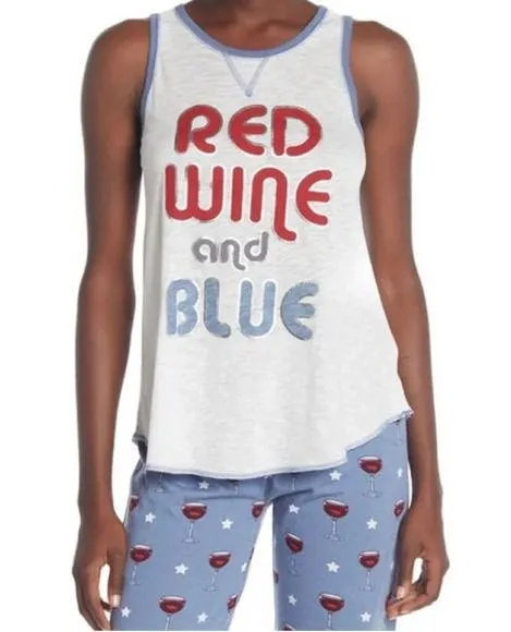 Scoop neck Sleeveless Back raw cutout Front graphic text Red Wine and Blue Contrast banded trim Semi-sheer slub knit design Curved hem White color tank with blue and red writing Brand new with store tags Smoke free, pet free home Ships same or next day Bundle and save